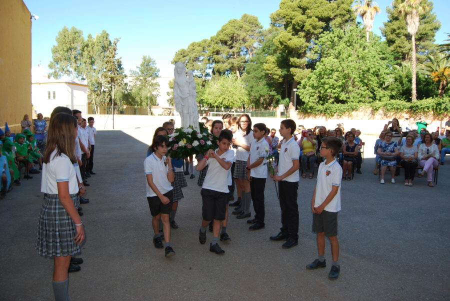 La Virgen blanca que han estado visitando los alumnos de Primaria, cada mañana de este mes de mayo para rezarle y llevarle flores, en la fuente de la salud donde permanece todo el año, ha sido hoy portada a hombros por los alumnos de 6º EP, que la llevaron primero al escenario de la representación para honrarla de nuevo en medio del acto mariano que celebraban, y después la volvieron a portar para devolverla a la fuente donde seguirá viéndolos pasar en sus idas y venidas por los jardines del Colegio.